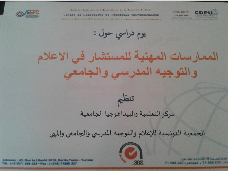 Boussaada H., (2017). « Centre de Didactique et Pédagogie universitaires : Vers le management de la qualité de la formation dans les institutions d’enseignement supérieur tunisien », Communication affichée : Poster In Colloque International « Education Ouverte : Ressources Educatives Libres et Ingénierie de Formation (RELIF 2017), Tunis - Hammamet, du 30 novembre au 2 décembre 2017. Colloque organisé par l’Association ATeL en collaboration avec l’Université Virtuelle de Tunis, l’UNESCO, l’OIF, l’ALECSCO et l’AUF.